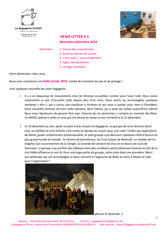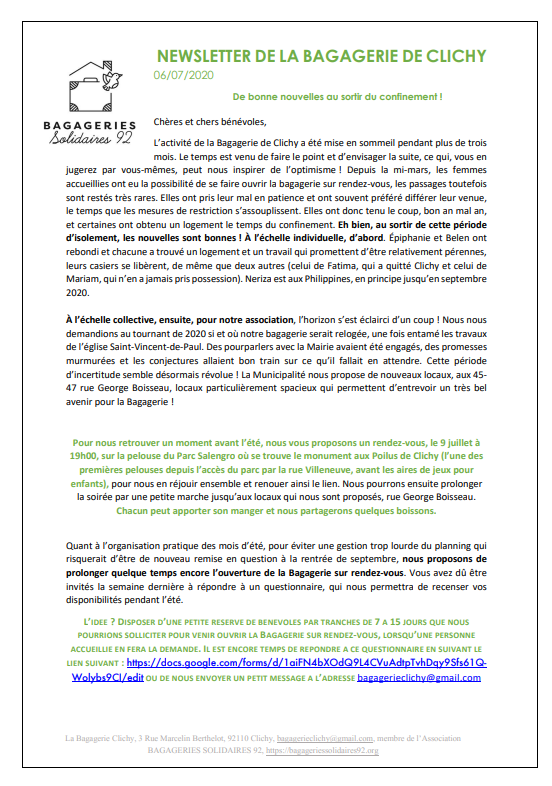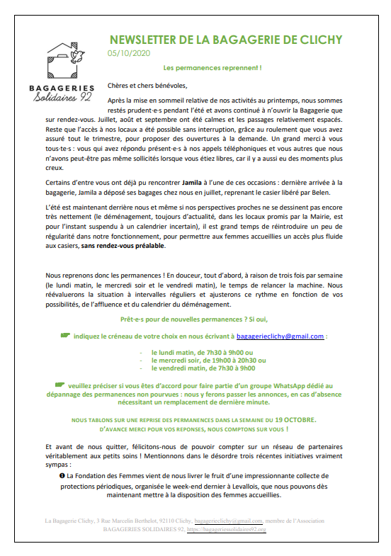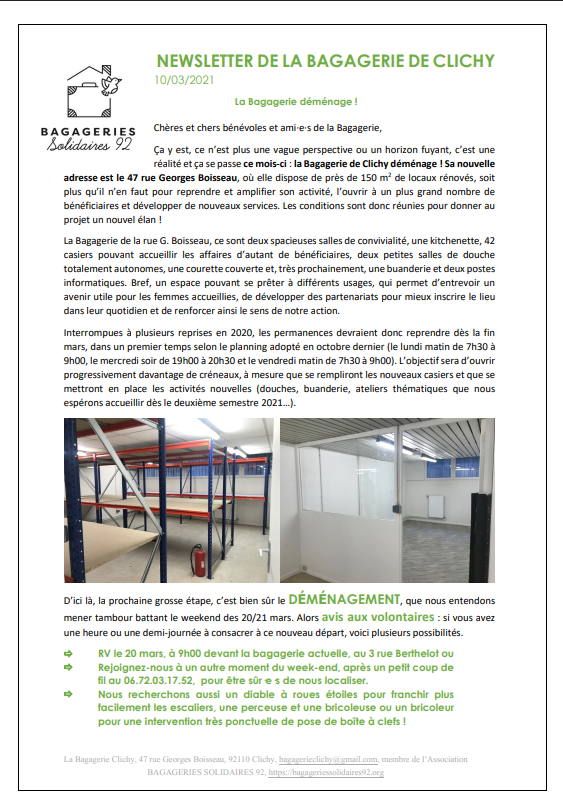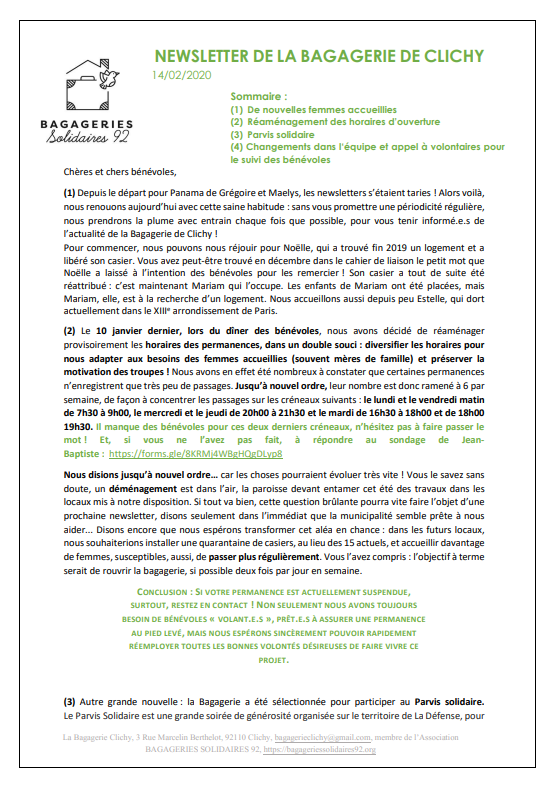 Médiathèque 2025 Témoignage d'une accueillie à la Bagagerie de Clichy 2024 2023 2023-07-03 Courant Ecologie humaine 2022 Témoignages 2021 Nouveau lieu à Clichy 2020 2018 Démarrage à Clichy et Colombes 20180923 Soir 3